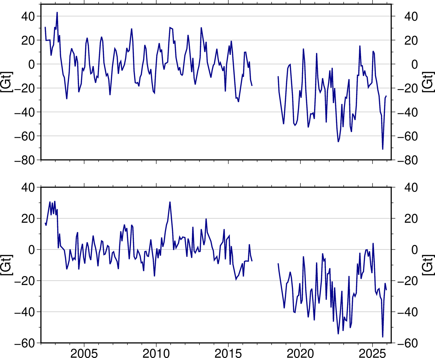 Mithilfe der Satellitenmissionen GRACE (Gravity Recovery and Climate Experiment, 2002–2017) und GRACE-FO (GRACE-Follow-On, seit 2018) lässt sich die globale Wasserspeicherung mit monatlicher Auflösung beobachten. Mit nunmehr 24 Jahren an Daten können langfristige Veränderungen analysiert werden.